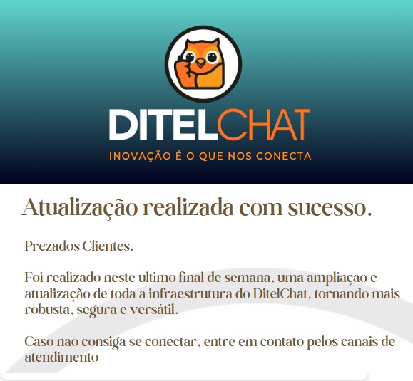 É com grande satisfação que informamos que foi realizado neste último final de semana com sucesso, a ampliação e a atualização de toda a infraestrutura do DitelChat, com o objetivo de tornar essa mais robusta, segura e versátil.